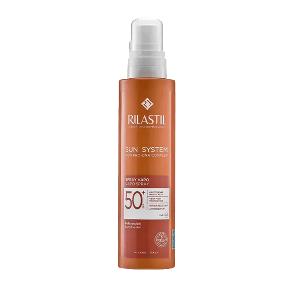 Rilastil Sun System Vapo Spray SPF 50+ is a high-performance body sunscreen spray with an ultra-light, fast-absorbing texture that offers broad-spectrum UVA/UVB protection. Enriched with Pro-DNA Complex® and vitamin-rich actives, it shields the skin from sunburn, sun rash, and premature aging while maintaining skin elasticity and hydration.