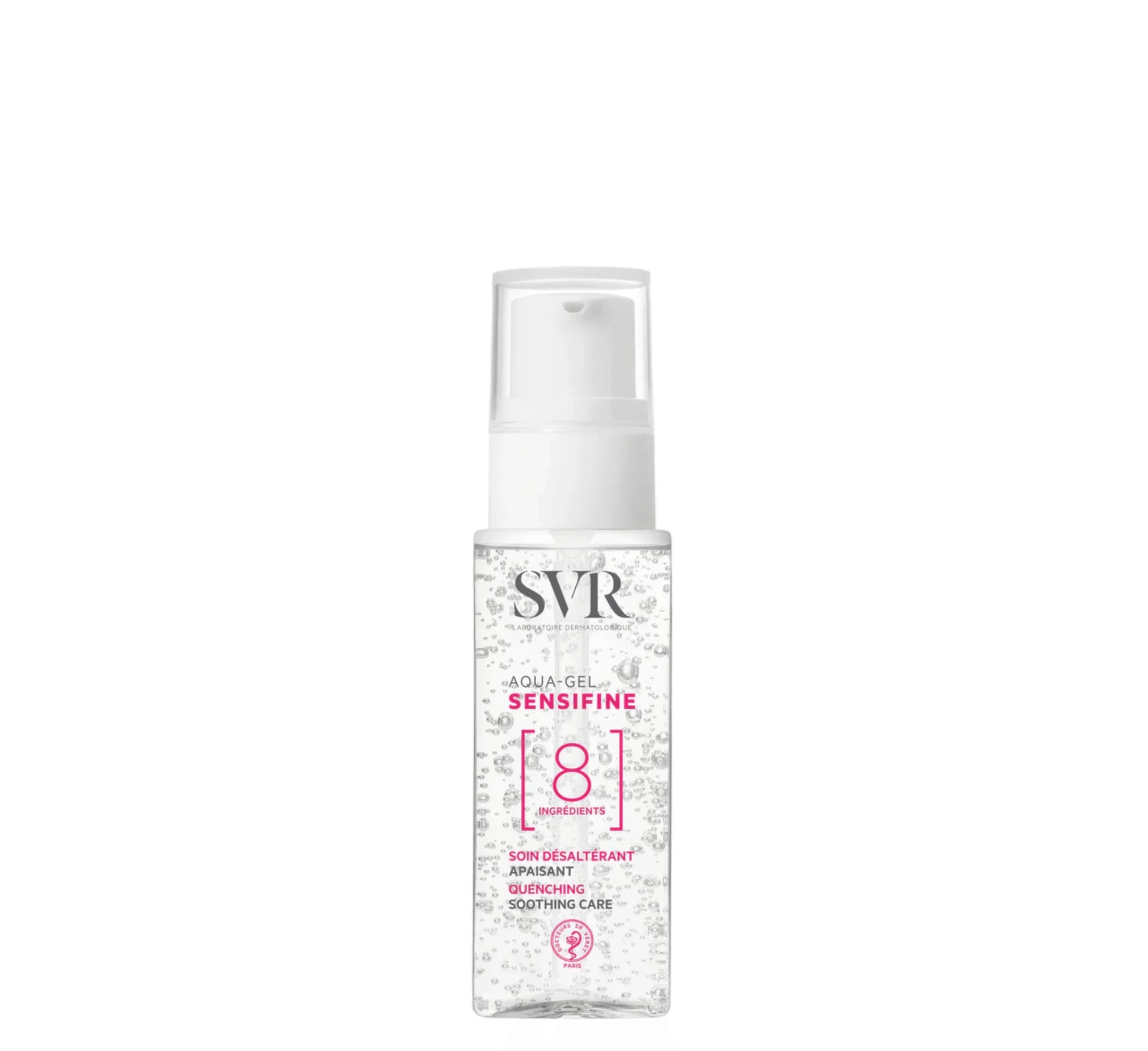 SVR Sensifine Aqua-Gel 8 është një xhel minimalist i formuluar vetëm me 8 përbërës të përzgjedhur me kujdes, 97% me origjinë natyrale, i projektuar për të qetësuar dhe hidratuar intensivisht lëkurën delikate. Tekstura e tij ultra e freskët e xhelit e pasuruar me Aloe Vera ofron rehati të menjëhershme dhe hidratim 12-orësh.