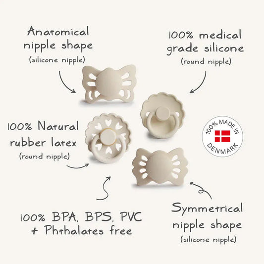 Frigg crafts baby care essentials with a focus on gentle comfort and thoughtful design. Their pacifiers blend soft, durable materials like natural rubber or silicone with timeless and modern color palettes for a calm, stylish touch.